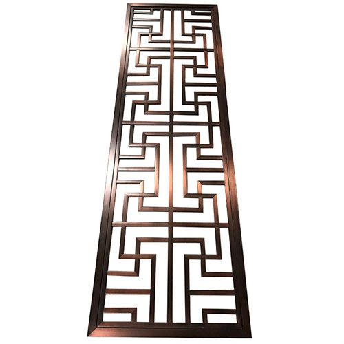 别墅拉丝红古铜不锈钢花格屏风很少通过水镀工艺镀上颜色,由于受到流水的影响,线条稍微复杂的花格屏风,都不适采用水镀工艺镀色。类似于这款花格屏风线条简单不锈钢管材的规格也比较大,才可以采用水镀工艺进行彩色电镀,水镀红古铜成品效果非常好。适用于别墅隔断装饰,家庭玄关装饰,书房隔断等,看着高端大气,牢固程度与耐用程度都是非常好的。