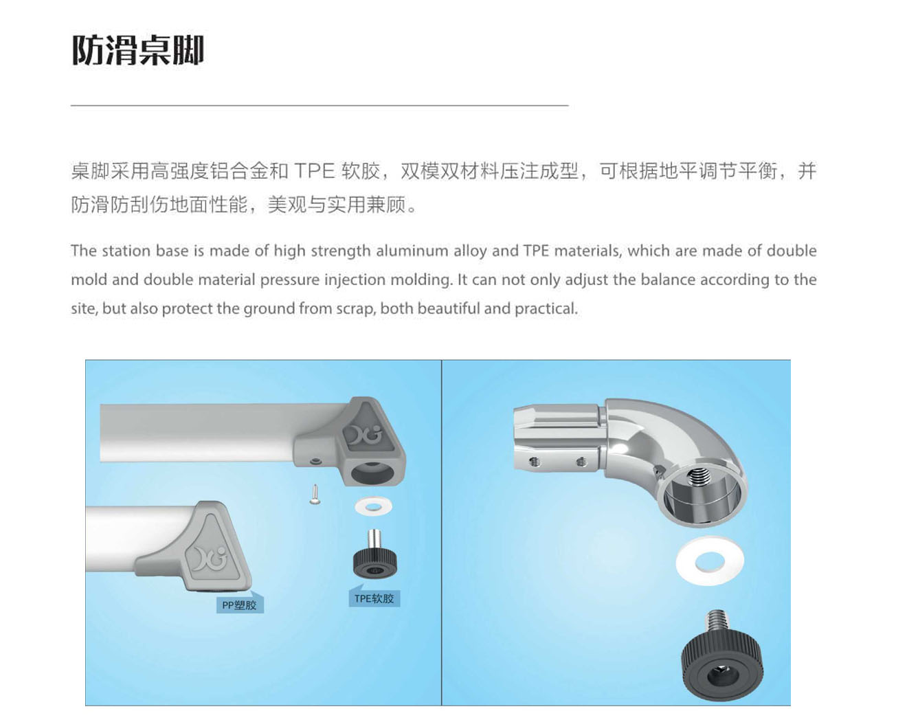 5.桌脚掌:1.2mm壁厚,脚套底有4个平衡调节机构。